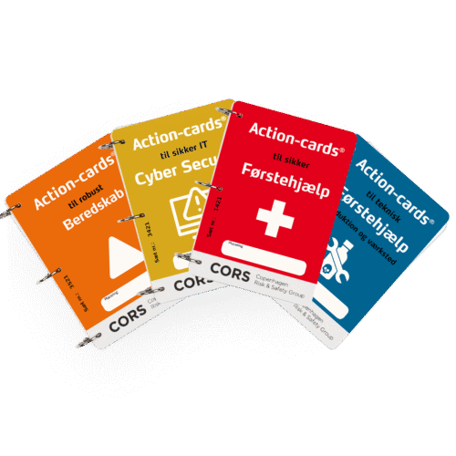 Action-cards® giver medarbejdere klare, visuelle trin-for-trin instrukser at følge i kritiske situationer – fra ulykker og brande til cyber- og andre sikkerhedshændelser. Kortene er designet til hurtig adgang og daglig brug og støtter teams i øvelser og reelle nødsituationer.